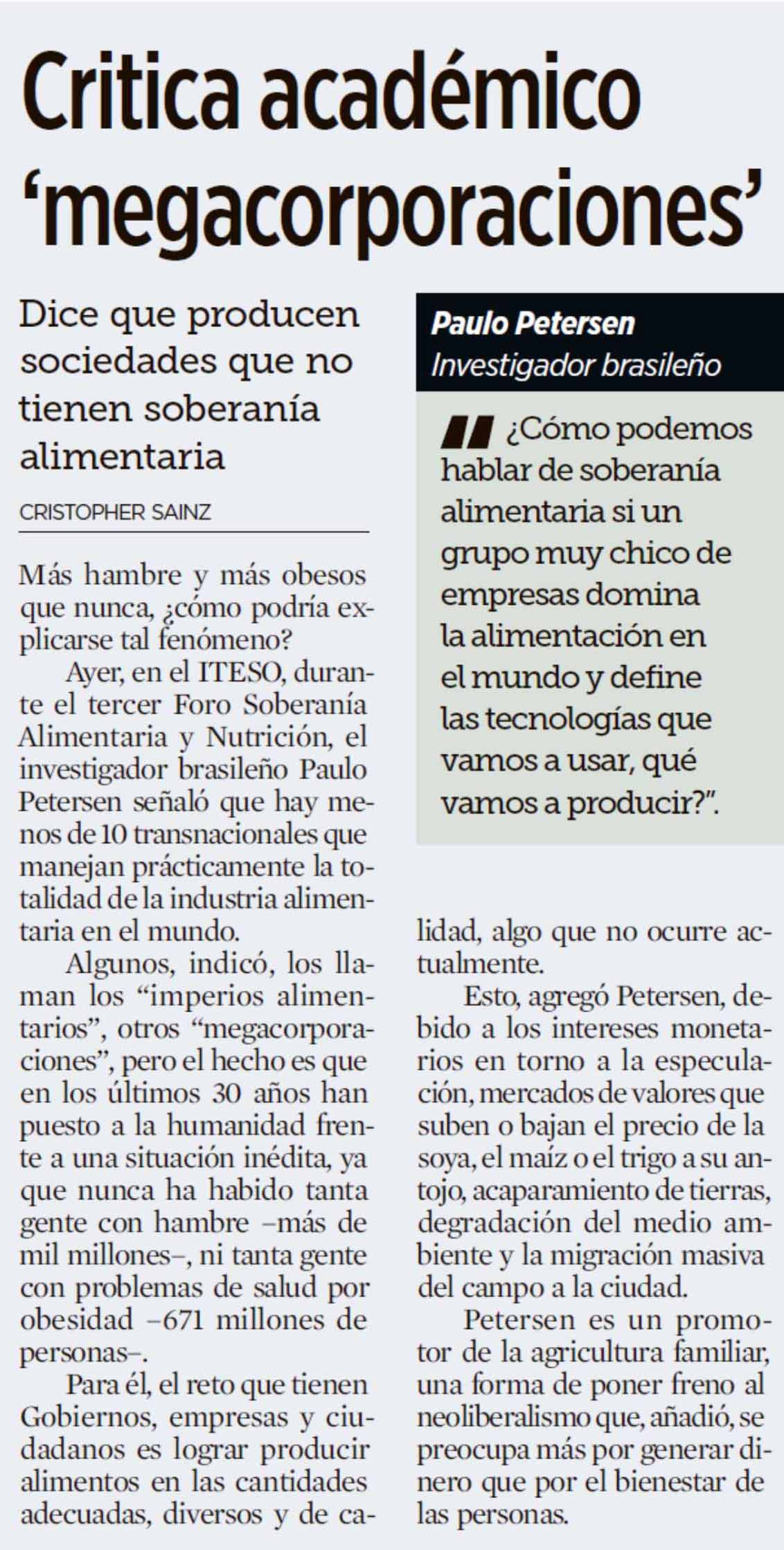 Más hambre y más obesos que nunca, ¿cómo podría explicarse tal fenómeno? Ayer, en el ITESO, durante el tercer Foro Soberanía Alimentaria y Nutrición, el investigador brasileño Paulo Petersen señaló que hay menos de 10 transnacionales que manejan prácticamente la totalidad de la industria alimentaria en el mundo. Para él, el reto que tienen Gobiernos, empresas y ciudadanos es lograr producir alimentos en las cantidades adecuadas, diversos y de calidad, algo que no ocurre actualmente. (Mural)